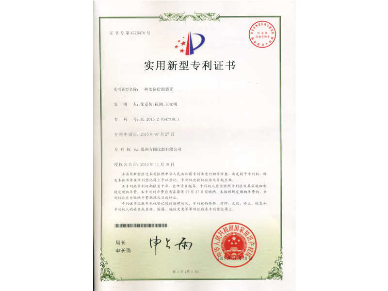 中國實用新型專利:一種水位檢測裝置(ZL 2015 2 0547318.1)